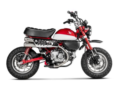 This beautifully shaped exhaust perfectly matches the Monkey’s unique character. The twin conical mufflers are constructed from stainless steel, featuring muffler sleeves in titanium, a race-proven material. The exhaust system offers power gains through the entire rpm range and reduced weight, and it delivers a deep, rewarding sound. The sporty but classic appearance can be further enhanced by adding the specially designed carbon-fibre heat shield. An optional header in stainless steel is available for an upgrade to a full system.